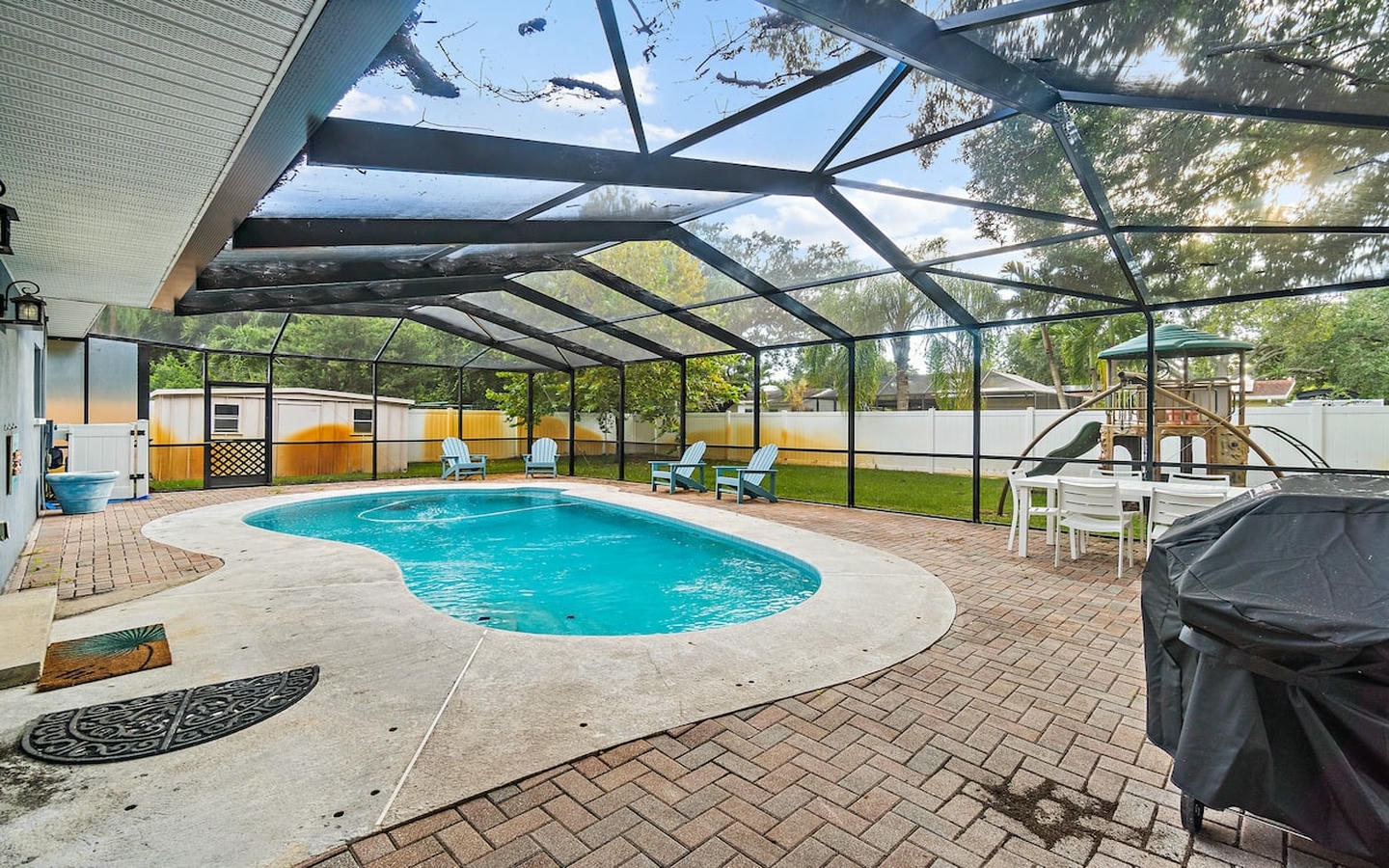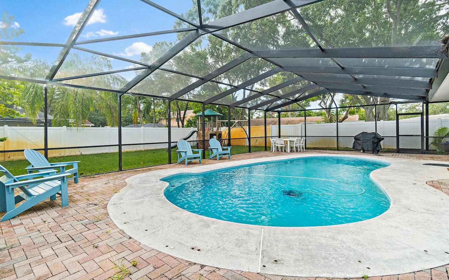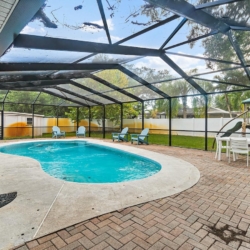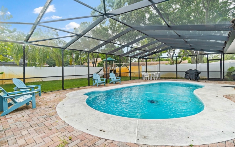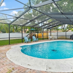 Retreat to the spacious master suite, featuring a walk-in closet and dual-sink vanity, while the inviting backyard oasis awaits with a sparkling caged pool, private patio, and privacy fence. Soak up the Florida sunshine in style—this is the dream vacation spot you’ve been waiting for. Your escape to paradise begins here!